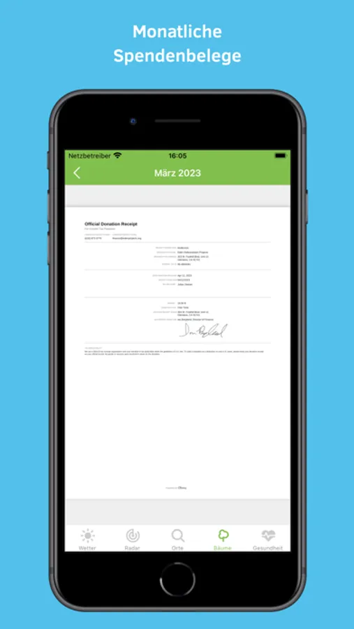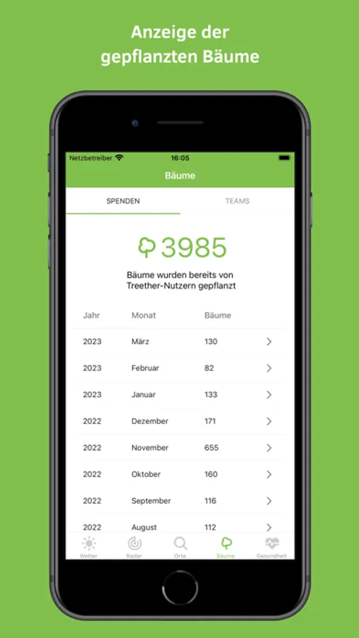 Nicht nur Wetter: Auf der Startseite wird die Anzahl deiner gepflanzten Bäume angezeigt. Unter dem Menüpunkt Bäume werden die Gesamtanzahl der gepflanzten Bäume und die monatlichen Spendennachweise angegeben.