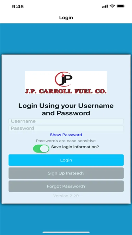 This is the JP Carroll Fuel Company app. The app allows users to view information about their account, order fuel, request service, and make payments on their account using their device. Customers create a login for this app by using an account number that they obtain from registering on our website. There is no cost or fees to register and use this app.
