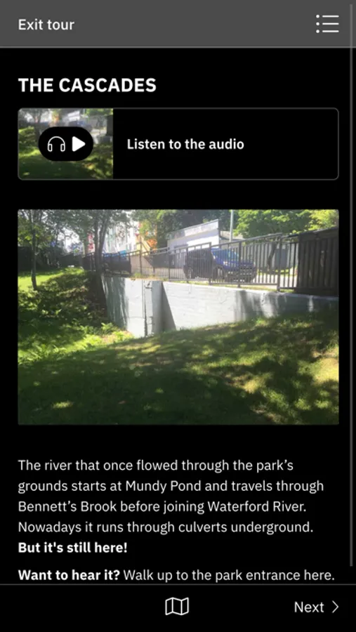 • When you're in the park, the app triggers automatically by GPS as you pass different locations. Voices whisper in your ear, while your smartphone shows photographs, maps and revealing details.