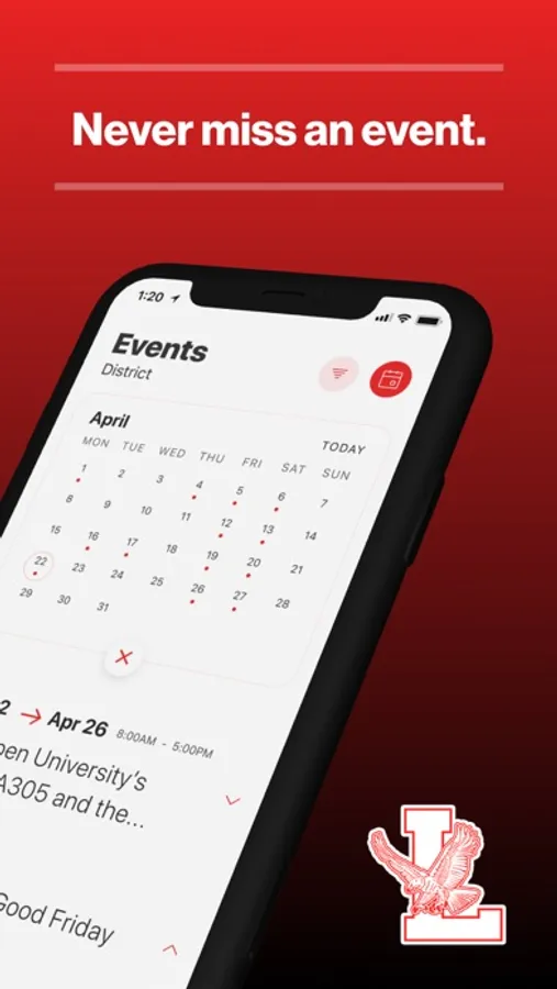 The event section shows a list of events throughout the district. Users can add an event to their calendar to share the event with friends and family with one tap.