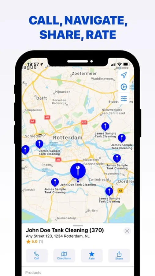 • Functions like „Call", „Navigation“, „Rating“, „Share" will help you with your daily work.