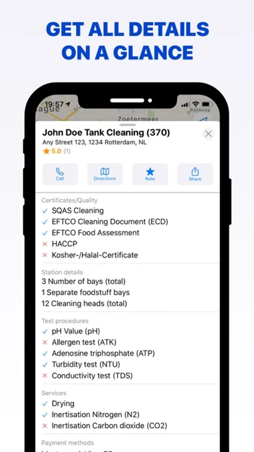 You are not sure which services are offered by each cleaning station? Bulkradar eases your search and decision making process no matter what product categories are shipped in your equipment (foodstuff, non foodstuff or dangerous goods). The bulkradar app shows all listed cleaning stations on a map. Just click on a station and to get extensive details and information regarding that station like opening hours, contact details, services, certificates.