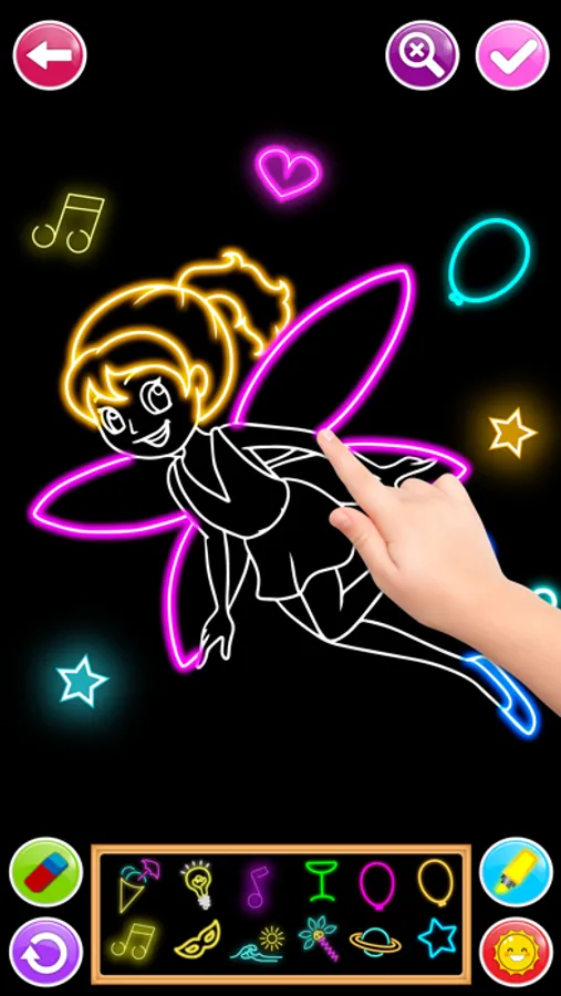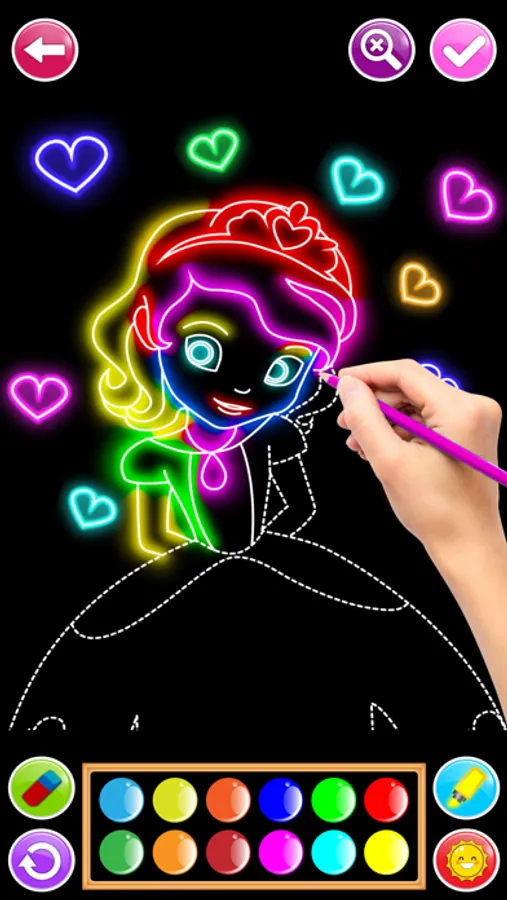 - Hearts, stars, rainbows, dresses, cartoons and other beautiful stickers in Glow draw art - Numbers ,Alphabets !