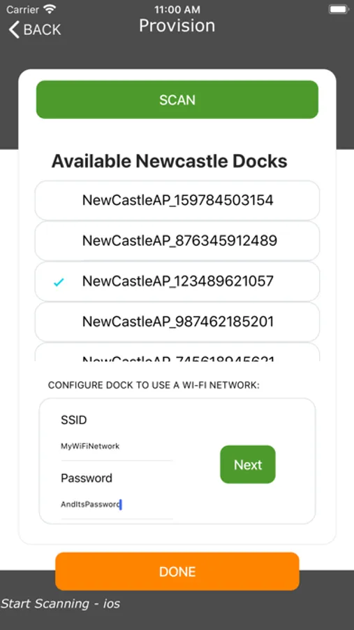In addition to viewing battery data, this app is also used to setup and connect the Newcastle PowerDock Stations. The Provision page of the app is an easy-to-use interface to provide the PowerDock with your network credentials. The PowerDock will then disconnect from the mobile device and transmit battery health information on its own using the assigned network.