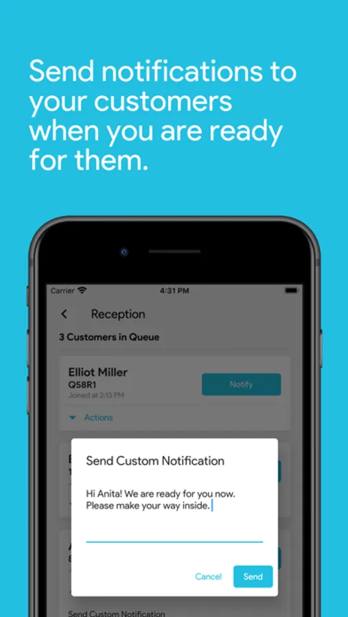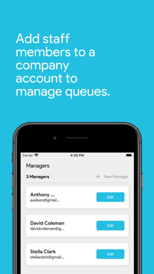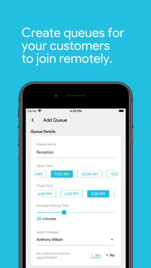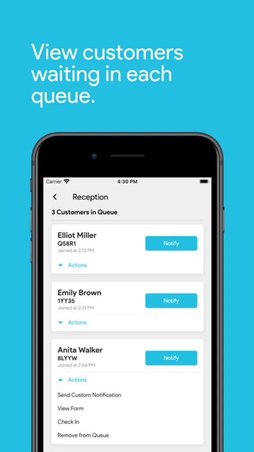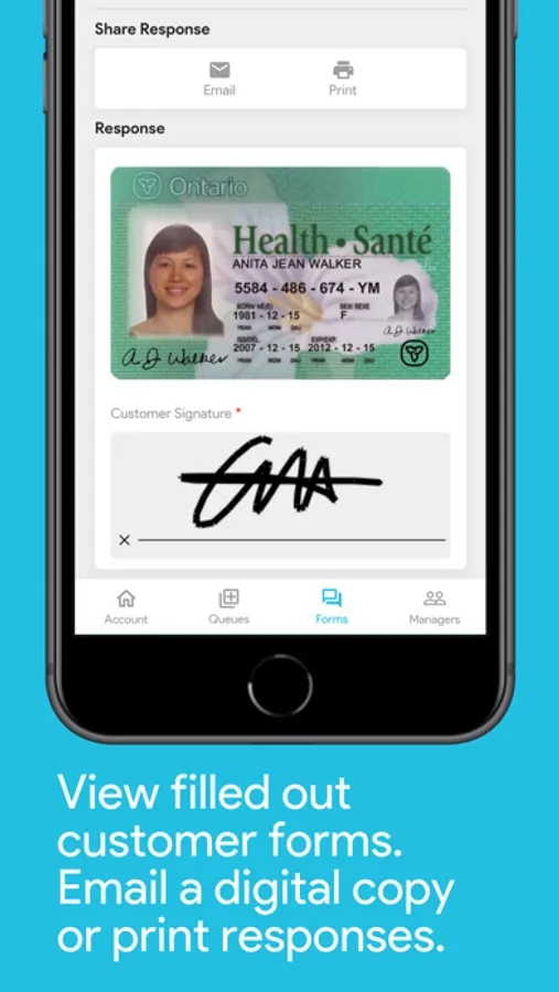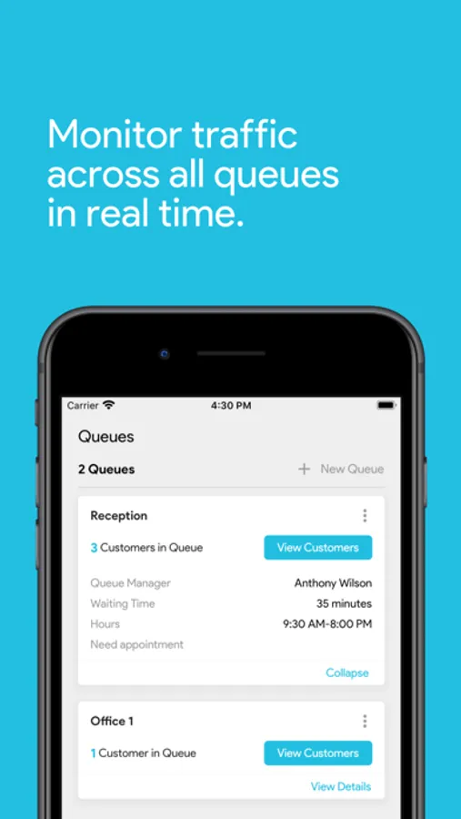 VQueues Business enables businesses to create and manage virtual queues. Queue managers are able to monitor customers in real time. Managers can create forms that include emails, address, photos and signatures fields for customers to fill out upon joining the queue. Queue managers can also alert a customer through notifications and SMS when it is time for them to enter the business.
