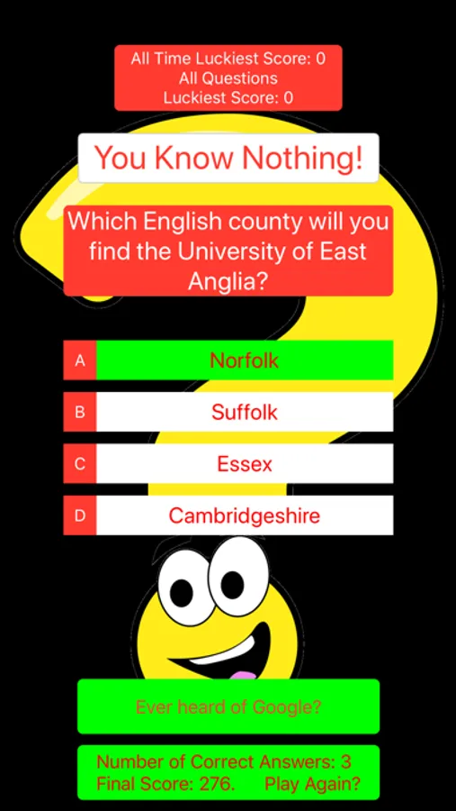 Think you are a trivia master? You Know Nothing Trivia will put you to the test in quick 10 question trivia games. Be aware, the app is a bit of a wise guy, randomly spouting out witty comments to your answers. You Know Nothing is likely to be unimpressed with your trivia skills and will let you know at the end of each quiz just what It thinks of your performance. With thousands of questions, multiple categories, sound effects and insults, this app is sure to help pass the time, even if you only have a couple of minutes. Try to beat your high score, either overall or in a specific category. Haptic feedback is supported. Good luck!