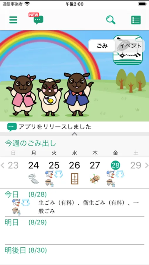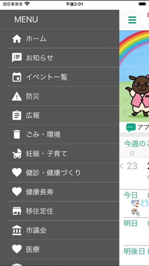 市のイベントやごみ収集カレンダーの情報を確認できます。