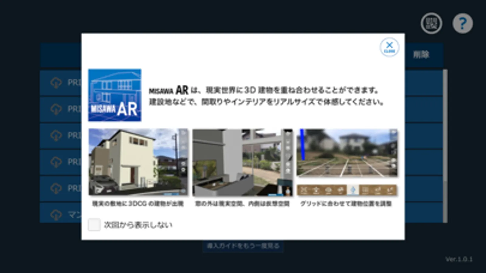「MISAWA AR」(ミサワ エーアール)は、ミサワホームの住まいをARで体感できるアプリです。ARで出現する3DCGは、建物の外観を精密に表示するだけでなく、部屋の中を動き回ったり、窓から外の景色を眺めることもできます。