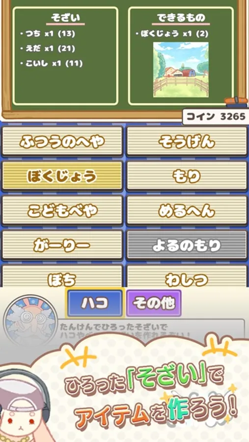 小屋に置く「ハコ」によって、うさぎの種類や能力が変化します。