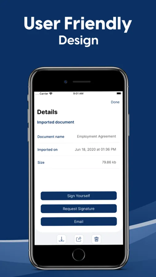 Once imported, you can easily edit the document by applying a signature, additional text, free form styling and dates / initials. You can then share the documents with other apps or send via email or fax.