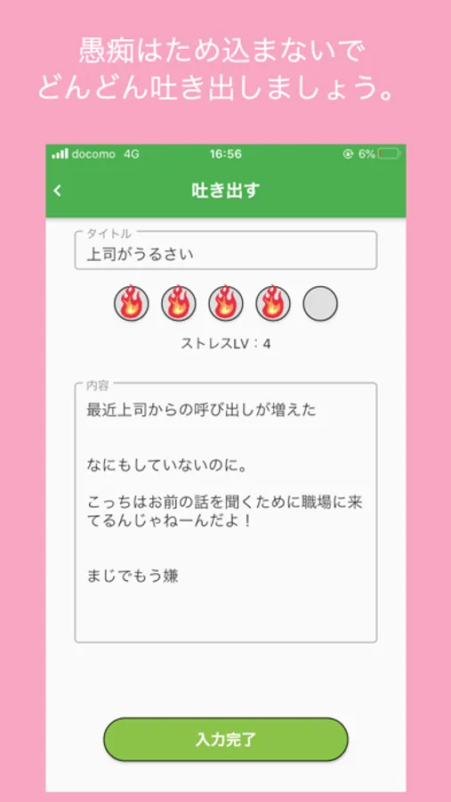 ・愚痴のタイトル、愚痴レベル、愚痴の内容を入力。