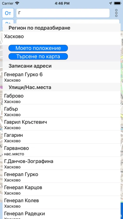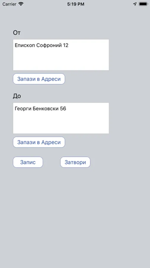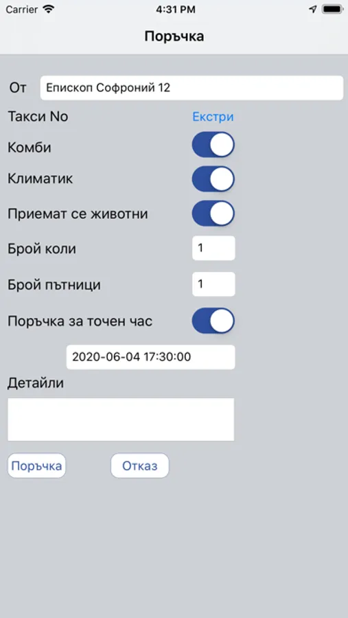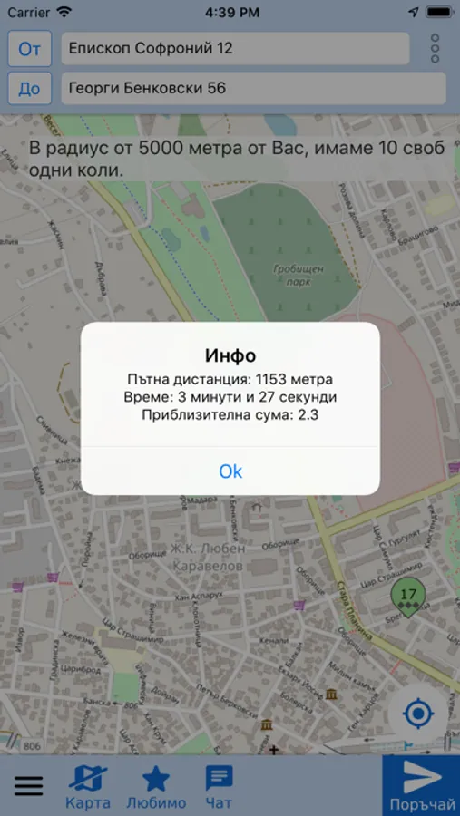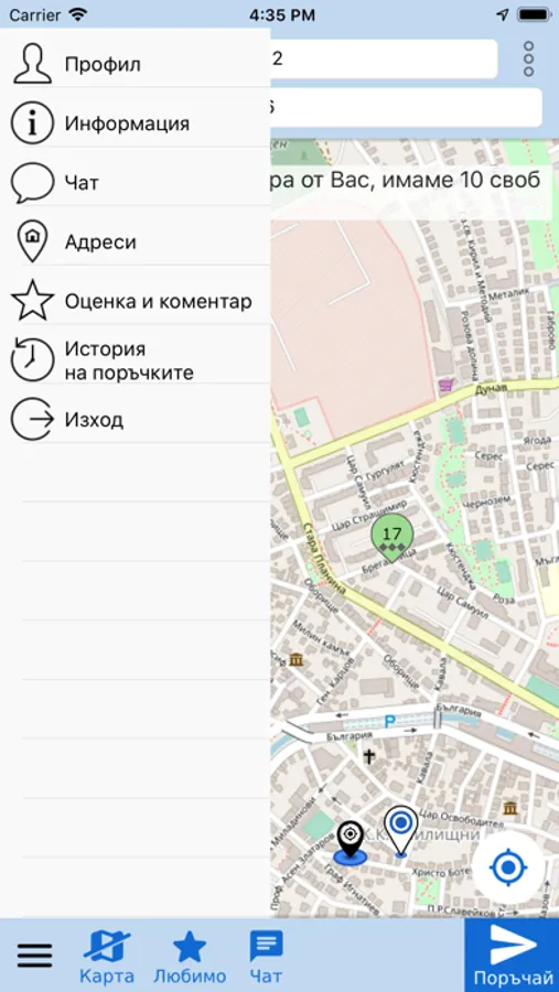 Натиснете бутона ОТ при стартиране на началната страница и наместете червения маркер, за да изберете точния адрес на Вашата локация. Ако искате различен адрес от този на който сте , преместете маркера на желаната от Вас локация. За да разберете колко ще Ви струва курса натиснете бутона До и попълнете крайния адрес. След коректно попълване на информацията ще разберете разстоянието и приблизителната цена на услугата и натиснете бутона Поръчай .