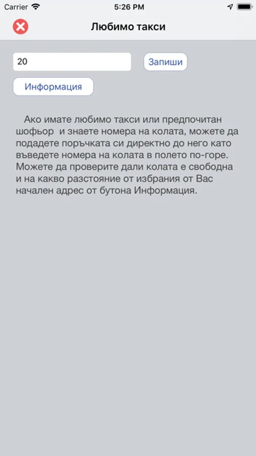 Приложението предоставя и възможност за избор на любимо такси , както и оценка на услугата. Може да запазвате често използвани от Вас адреси и при следващата поръчка да ги използвате директно от падащия списък на полетата „ОТ“ и „ДО“.