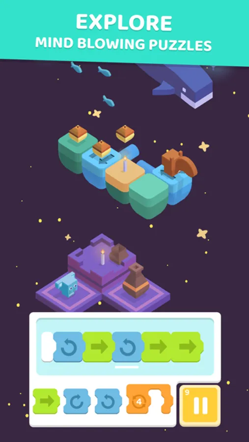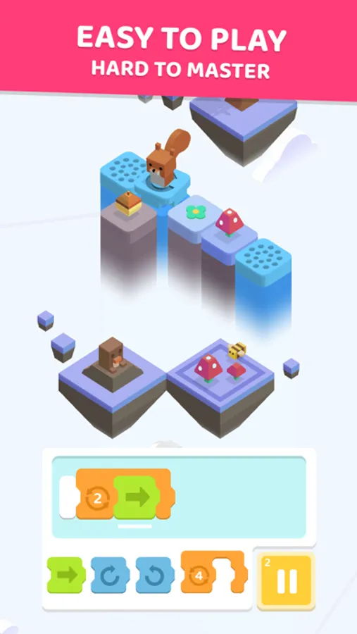 Arrange action blocks wisely to form your solution and show your characters the way to collect their favorite food. Don't fall, it hurts!