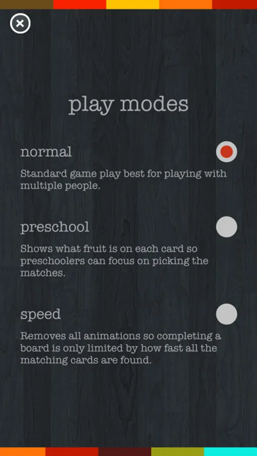 Multiple modes allow you to adjust game play to your preferences. Preschool mode shows what's on each card when the game starts and is great for little kids that are just learning how to match. Speed mode is for the more competitive player. All animations are turned off so the only thing slowing you down is how fast you can find all the matches. (Pro tip: try tapping two cards at a time.)