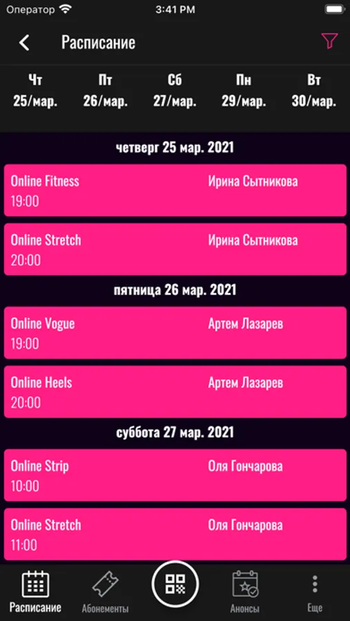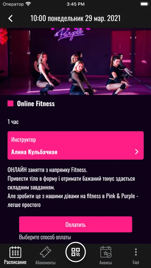 Регистрация в клубе, просмотр расписания и абонементов, запись на тренировки.