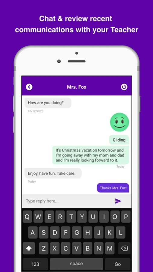 * A Chat feature in the app allows you to have a secure back-and-forth about any particular response or commentary your shared with your teacher or school professional