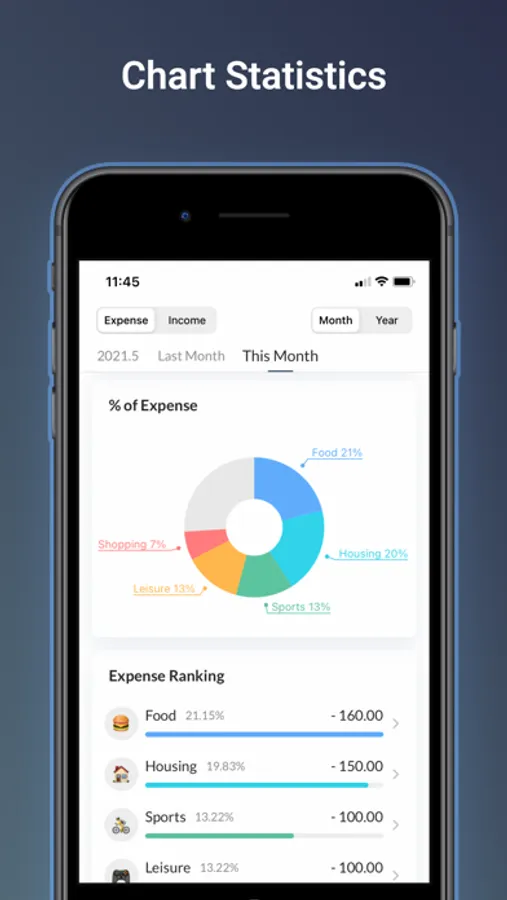 - Chart statistics: line charts show income and expense trends, and pie charts show income and expense category ratios for a clear view