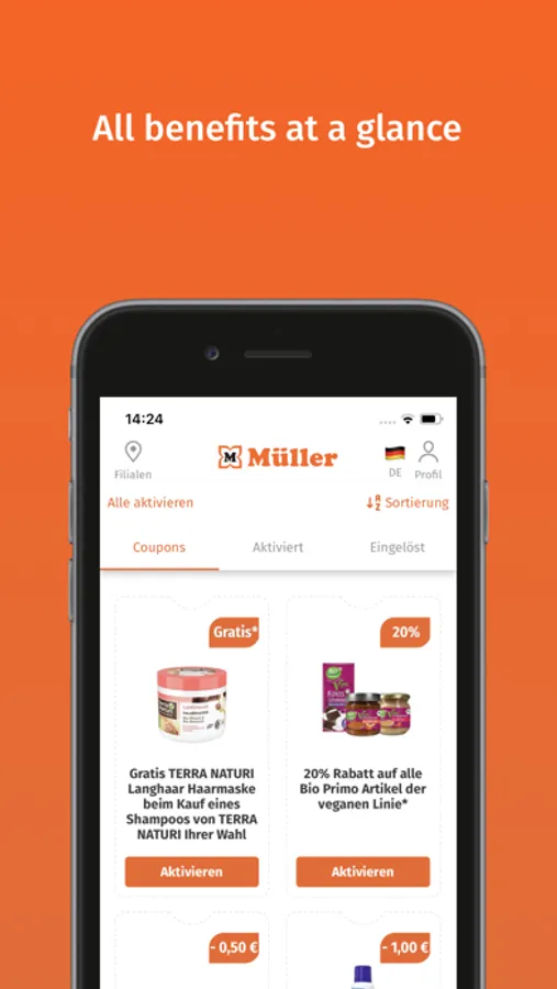 The Müller App offers many benefits, such as a digital customer card, coupons, sweepstakes, and more. Take advantage of these benefits!