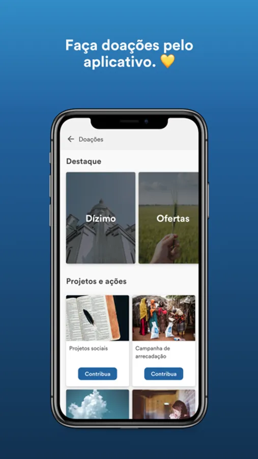 - Doe ou contribua com a igreja diretamente pelo aplicativo através de cartão de crédito ou boleto.