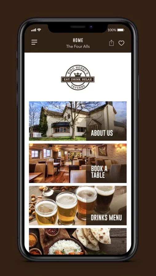 Order a delicious meal or a relaxing drink straight to your table at whichever King Henry’s Tavern you choose to visit. Also available is ‘Click & Collect’ for our Takeaway Service and purchases from our Corner Shops.