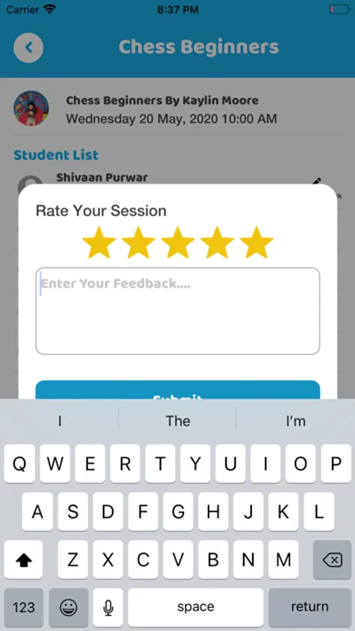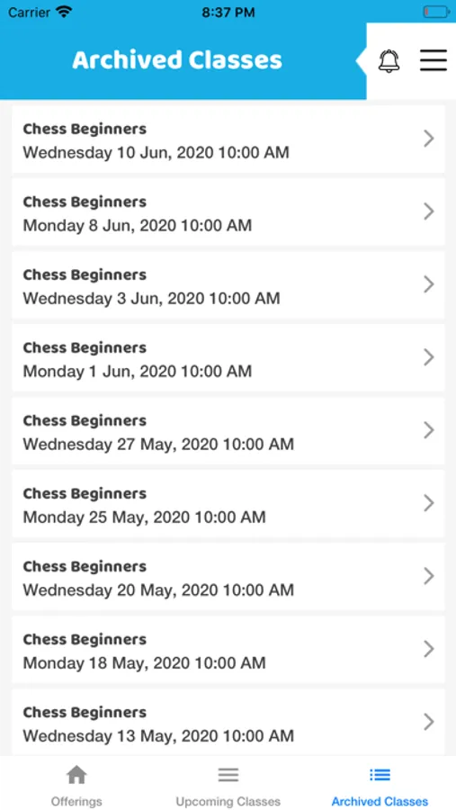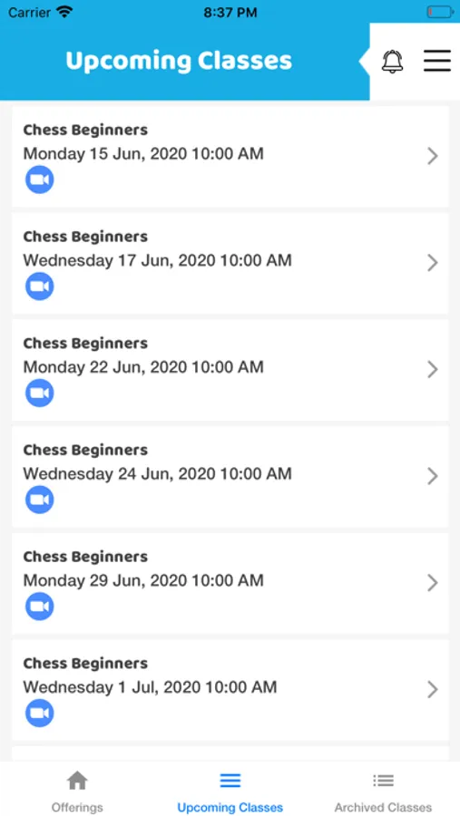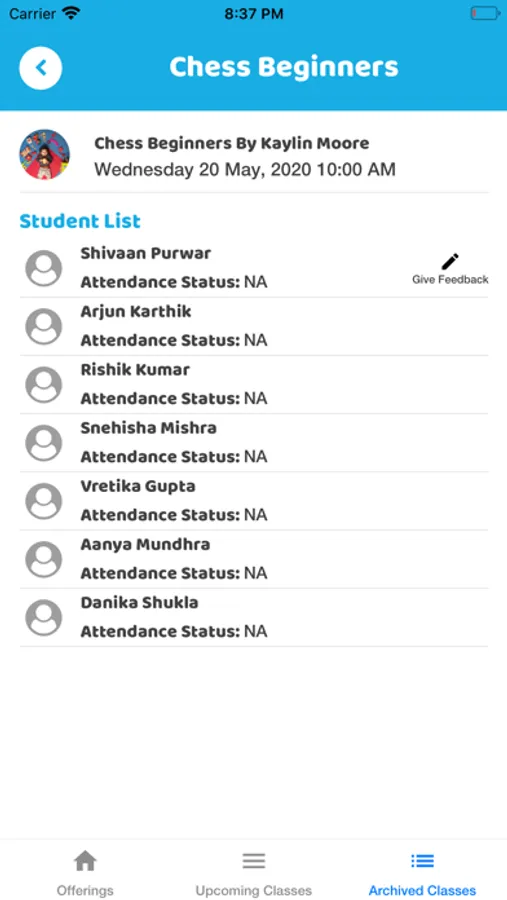 Users will be able to check upcoming classes as well archive of past classes, along with any other information associated with classes, e.g. Zoom Link, Notes, attendance, rating & Feedback etc