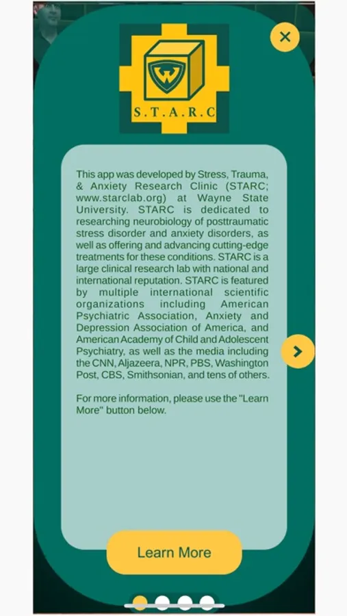 This app was developed by Stress, Trauma, & Anxiety Research Clinic (STARC; www.starclab.org) at Wayne State University. STARC is dedicated to researching neurobiology of post-traumatic stress disorder and anxiety disorders, as well as offering and advancing cutting-edge treatments for these conditions. STARC is a large clinical research lab with national and international reputation. STARC is featured by multiple international scientific organizations including American Psychiatric Association, Anxiety and Depression Association of America, and American Academy of Child and Adolescent Psychiatry, as well as the media including the CNN, Aljazeera, NPR, PBS, Washington Post, CBS, Smithsonian, and tens of others.