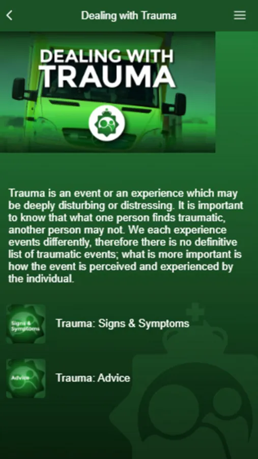 The App covers a range of problems faced by staff in the Ambulance service, such as anxiety, stress, PTSD (Post Traumatic Stress Disorder), depression, eating disorders, self-harm and more. It gives practical advice and support on how officers can maintain good mental health, spot warning signs for themselves and others, plus advice on how to get help for themselves and colleagues.