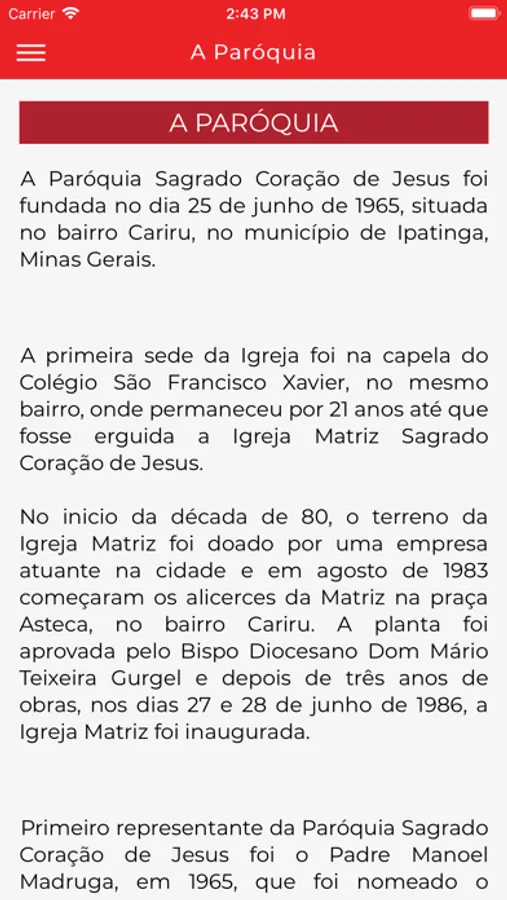 Este aplicativo foi pensado para ser rápido e intuitivo, levando até você todas as novidades e informações úteis da nossa Paroquia , além de várias funcionalidades.