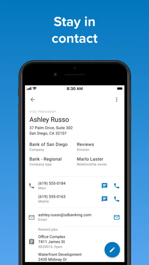 All of your clients, contacts and staff can be reached right from the app. Make a phone call, send a message or write an email, all with one touch.