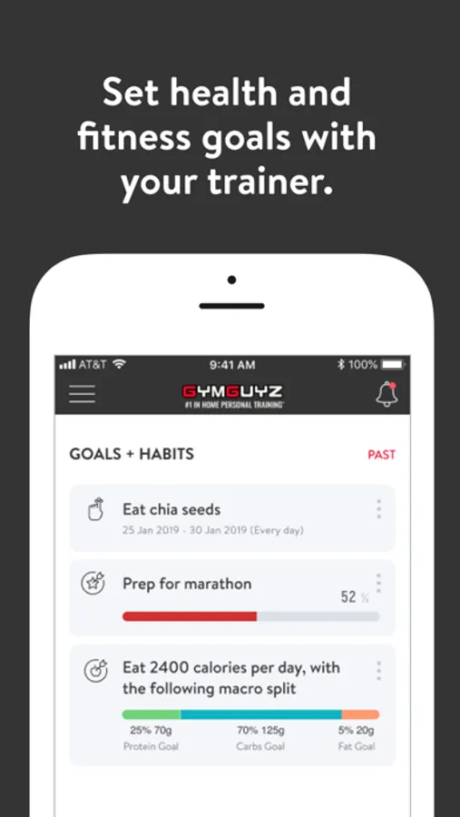 With the GYMGUYZ App, you can start tracking your workouts and meals, measuring results, and achieving your fitness goals, all with the help of your personal trainer.