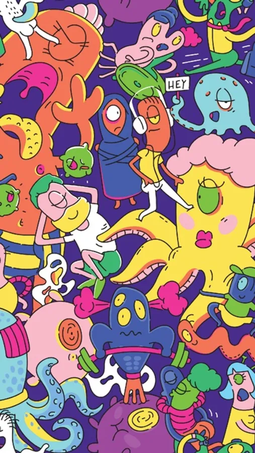 There's a cute couple kissing, an octopus-like business man with a mustache in a tie, a dog man with single lens glasses, several bubble characters, some aliens in the middle of hallucinations, some aliens asking for help or holding signs that say hey, an alien working on their laptop, a mother protecting her child, someone running late and rushing, someone listening to music, a nudist, someone on a call dressed for work, an older alien with a walking stick or cane, an alien in pain, a primped and prepped octopus-like alien with lipstick, an alien checking their makeup on a bench, a child riding a scooter, an alien in a hijab, an alien going for a run, a snakeboarding alien, an alien with a facemask on, a weightlifter, an alien in a wheelchair, and lastly an alien doing yoga.