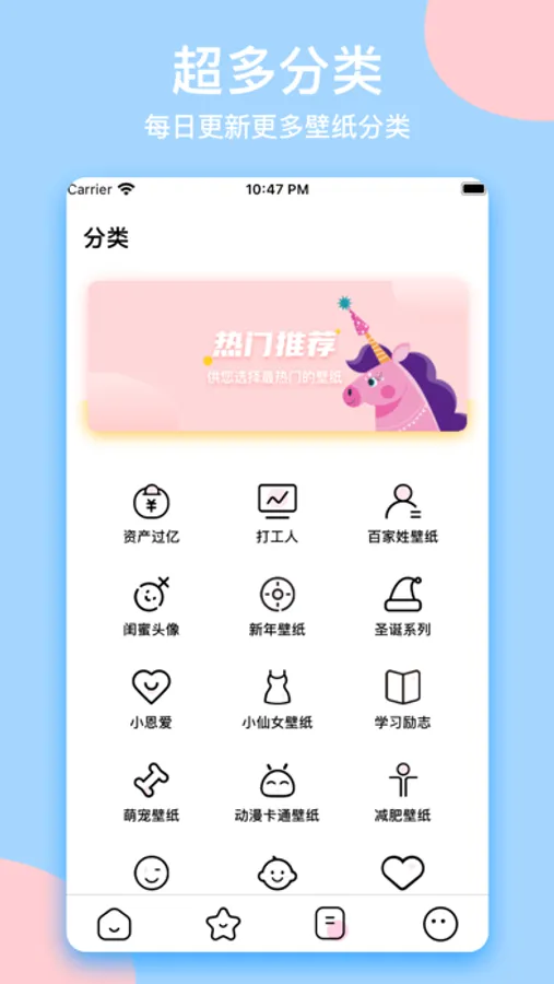 2、定制流行分类,切合时下流行,涵括动漫、电影、人物、风景等多个热门分类,还有一些特别的分类,让您能做与众不同的小仙女