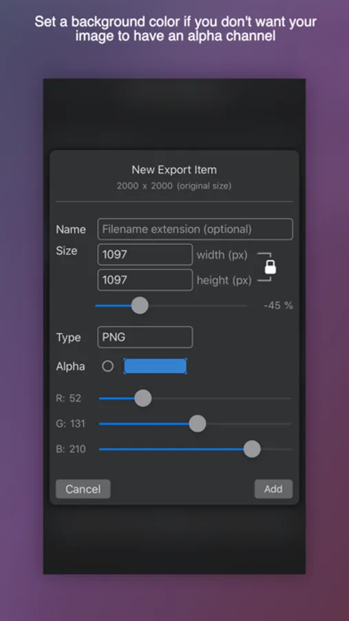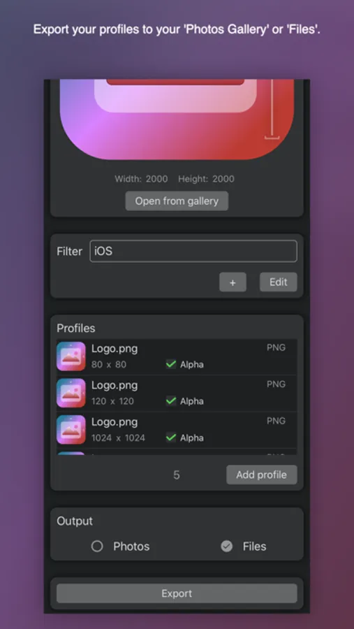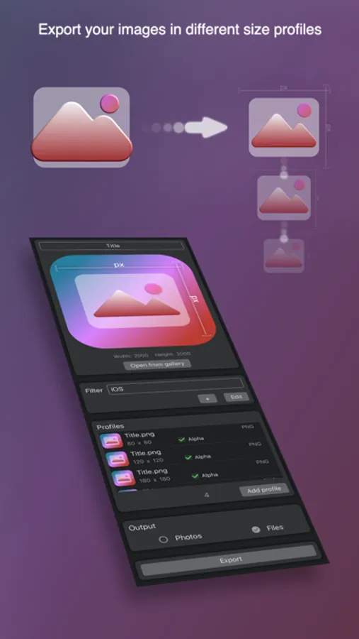 You can also determine the image size, file type, alpha channel and additional file name in your export profile.
