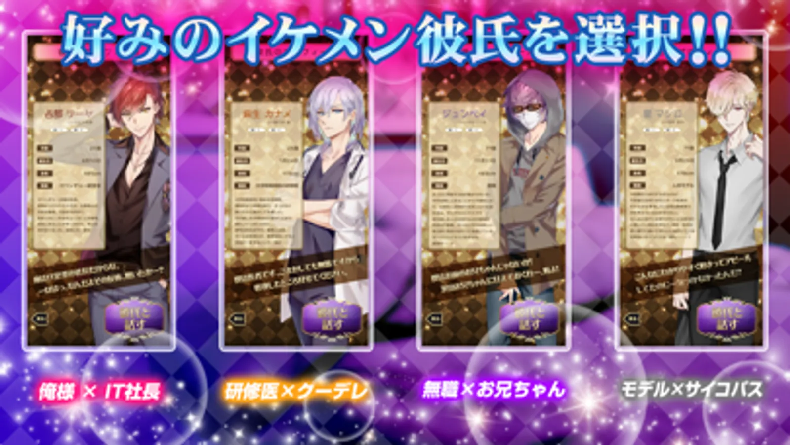 これまでの選択方式では実現できなかった、アナタが自由に送った言葉に彼達は反応し、現実彼氏と変わらないリアルな会話を返してくれます。