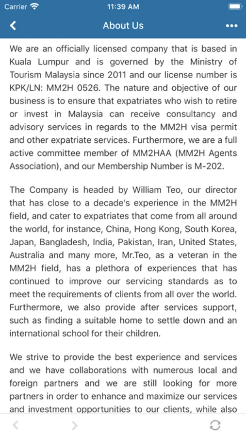 We are an officially licensed company that is based in Kuala Lumpur and is governed by the Ministry of Tourism Malaysia since 2011 and our license number is KPK/LN: MM2H 0526. The nature and objective of our business is to ensure that expatriates who wish to retire or invest in Malaysia can receive consultancy and advisory services in regards to the MM2H visa permit and other expatriate services. Furthermore, we are a full active committee member of MM2HAA (MM2H Agents Association), and our Membership Number is M-202.