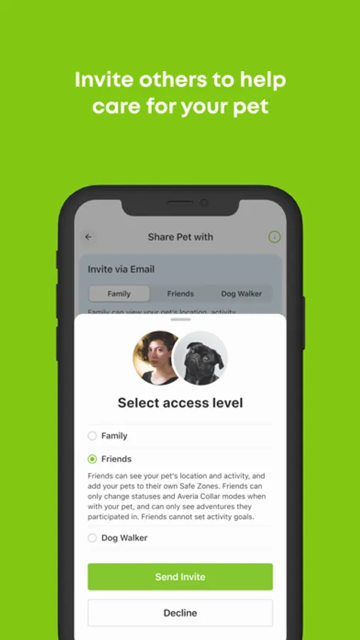 Share your pet(s) with friends, family, or the dog walker so you always know who they’re with and what they’re up to.