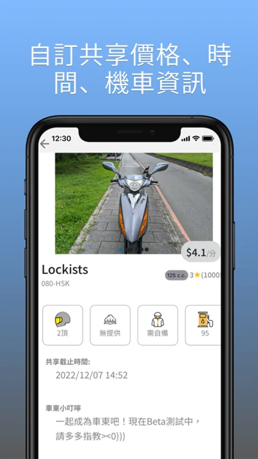 Lockists 機車共享平台,藉由APP與Lockists Lock 互動,讓車東可以放心的將機車零碎的閒置時間,共享給其他車客。