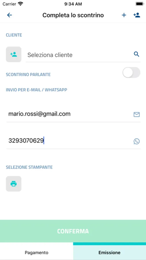 - Invio dello scontrino tramite email o Whatsapp al cliente