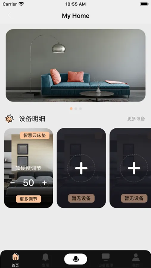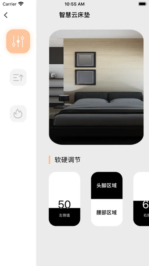3、设备控制包括床架升降、床垫软硬调节、床垫加热、止鼾设置等功能;