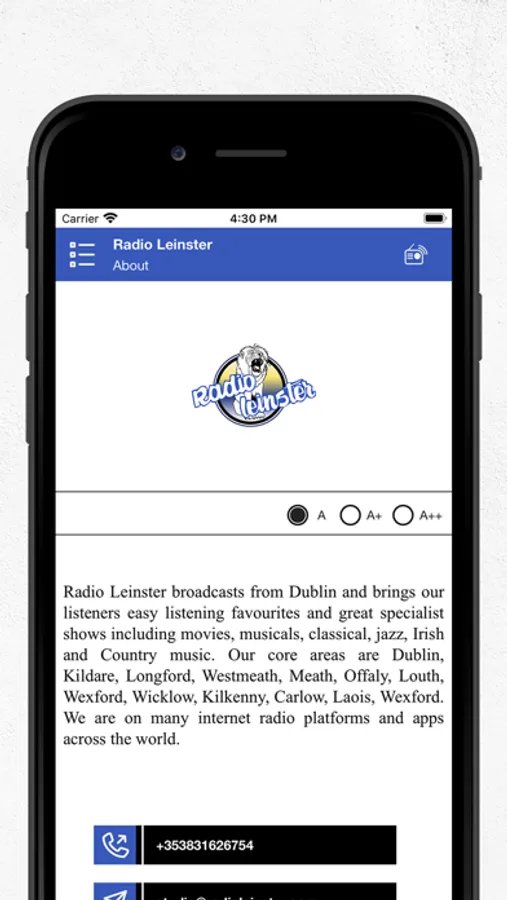 Radio Leinster broadcasts from Dublin and brings our listeners easy listening favourites and great specialist shows including movies, musicals, classical, jazz, Irish and Country music. Our core areas are Dublin, Kildare, Longford, Westmeath, Meath, Offaly, Louth, Wexford, Wicklow, Kilkenny, Carlow, Laois, Wexford. We are on many internet radio platforms and apps across the world.