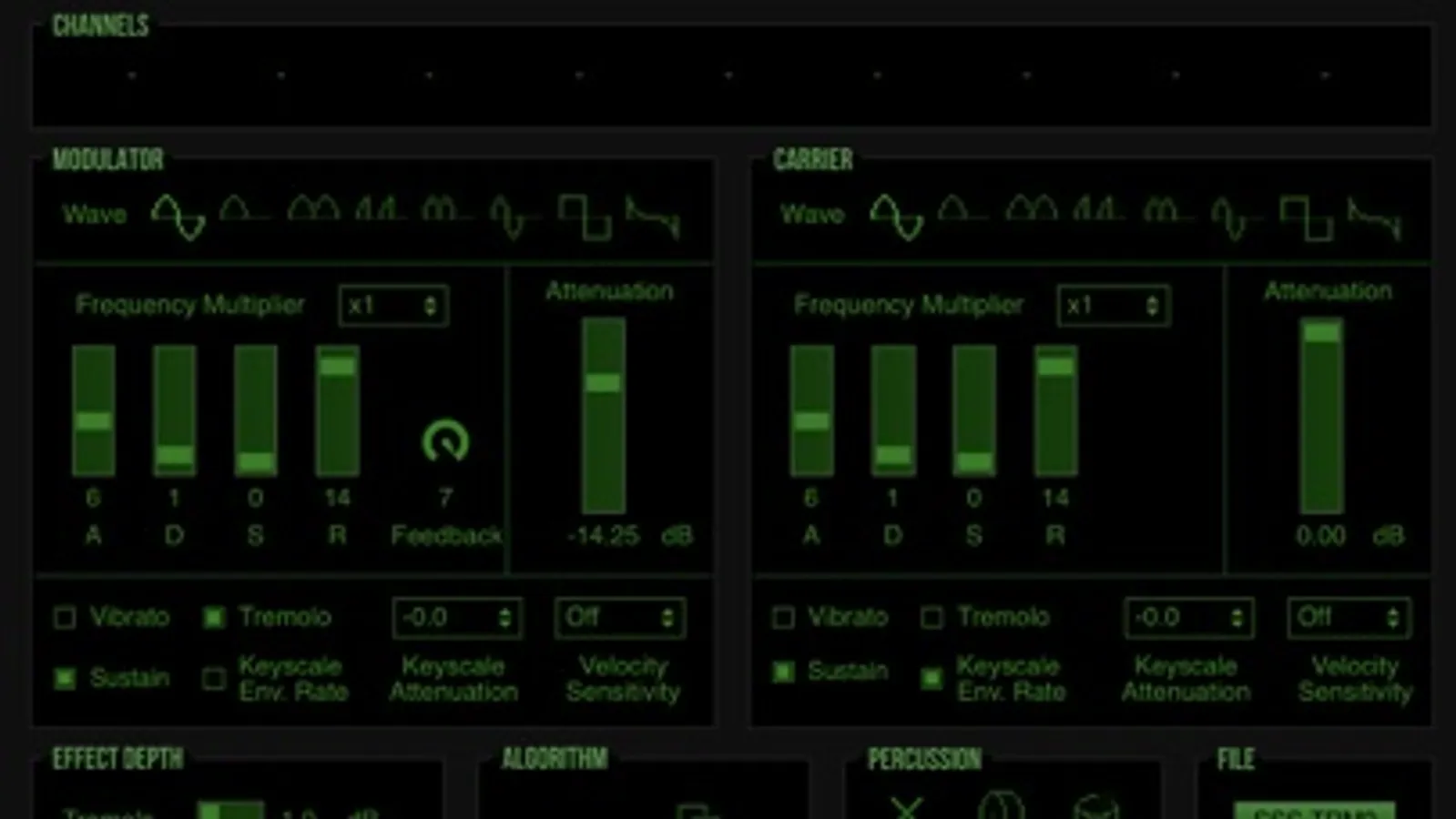 Each instance of the plugin emulates an entire OPL chip, but with this plugin, essentially you are just working with two operators: the carrier and modulator.