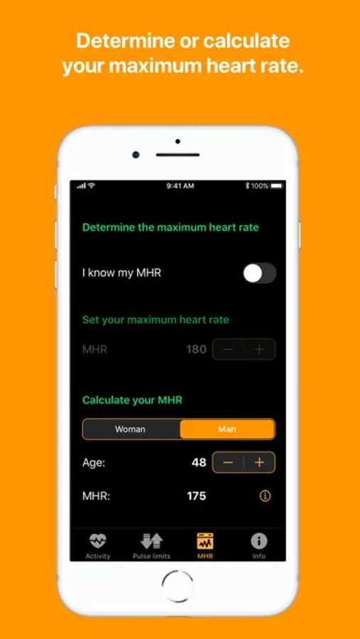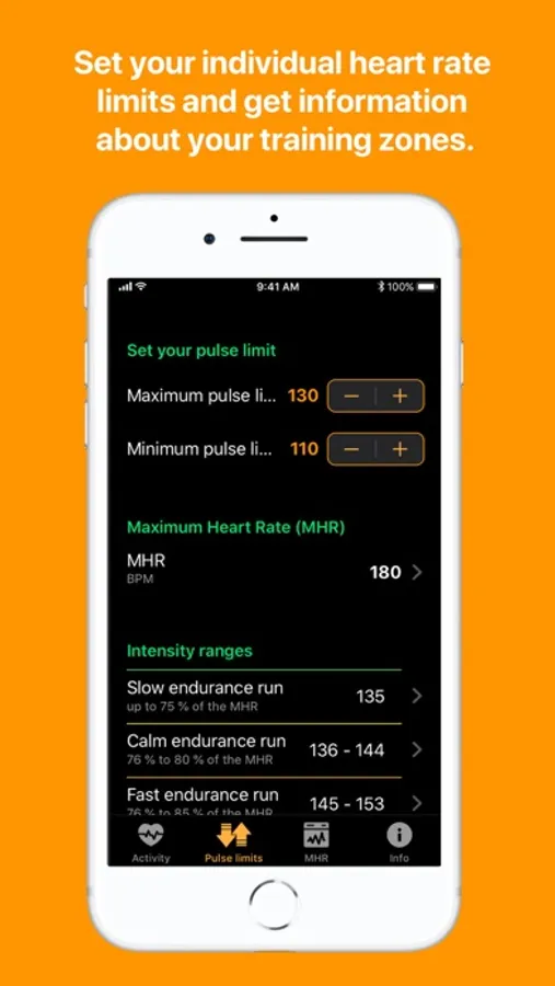 With the PULSALARM app on the iPhone you can determine your 5 intensity ranges based on your maximum heart rate. You can enter your maximum heart rate directly or have it calculated. Set your personal maximum heart rate limit, which you do not want to exceed during training, and your minimum heart rate limit. When these limits are reached, your Apple Watch will alert you by vibrating and/or beeping.