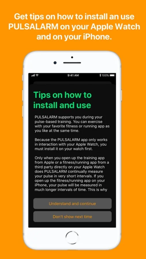 PULSALARM warns you via vibration or warning tone when you exceed your set upper and lower pulse limit and thus supports you in your pulse-based training. You can train as usual with your favorite fitness or running app. All you need to do is install PULSALARM on your Apple Watch.
