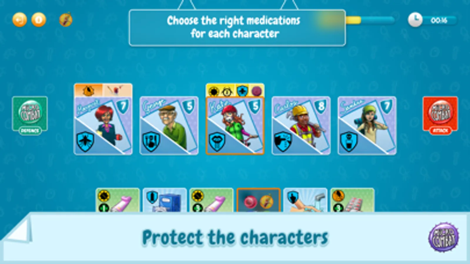 In Micro-Combat you will play the role of doctors, researchers and health-care personnel who have the mission of thwarting the attack of pathogenic agents which can make the population of your city ill. Your objective is to avoid any of the characters in the game losing all of their defenses, and to do this you will have different preventive measures and medications…which are not always enough! Micro-Combat is a cooperative game, so you need to work together in order to win!