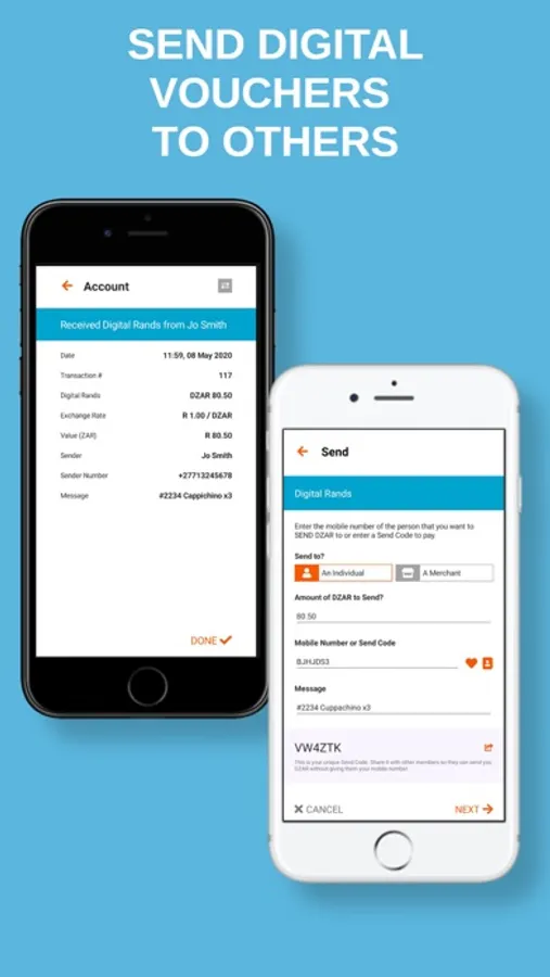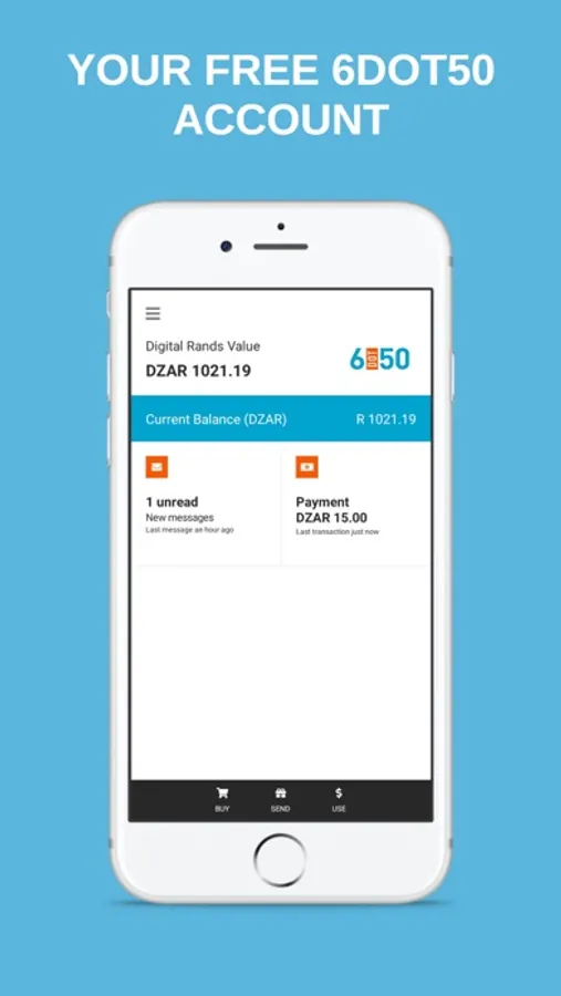 SEND Digital Rands to the mobile number or SEND CODE of any other 6DOT50 user for FREE.