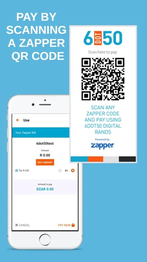 USE your Digital Rands to enjoy cashless, contactless and safe digital payments by simply scanning any ZAPPER QR Code, accepted at more than 25,000 merchants including eCommerce, retailers, restaurants, pharmacies, fuel stations, market vendors and charities, OR create and use a Token Number to pay for goods and services at till points including Shoprite, Checkers, Usave, K’nect, Poetry, Cape Union Mart, Keedo, Tread+Miller and Old Khaki stores OR simply SEND Digital Rands directly to a merchant’s 6DOT50 merchant account.