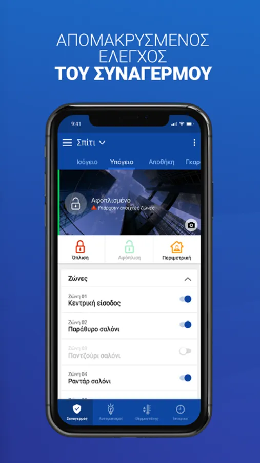 • Πλήρη διαχείριση συναγερμού (Όπλιση, αφόπλιση, απενεργοποίηση ζωνών)