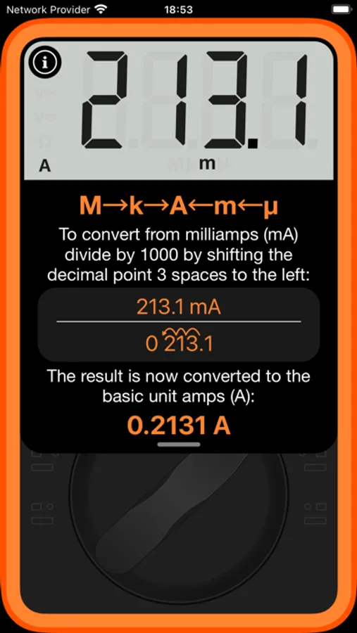 With our fun little app you just use your multimeter to take a reading, enter it into the app, select the same prefix (M, k, m or µ) as being displayed on your multimeter and the reading will be automatically converted to its basic unit (V, Ω or A). That's it!