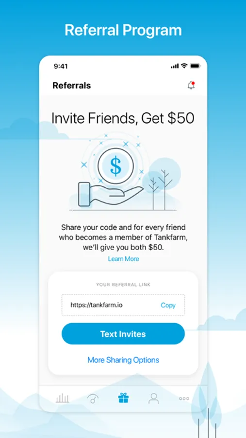 The Tankfarm app allows you to easily text, email, or share your unique referral link on Facebook or Twitter so you can share the good news about Tankfarm to your friends. You and your friends will earn rewards if they join.